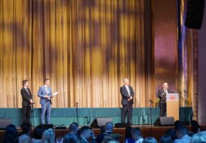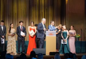Zur Verleihung der Abiturzeugnisse, bei dem die Schulleiter Michael Büchler und Matthais Fischer zu jeder Schülerin und jedem Schüler einige persönliche Worte richteten, gab es bei der Verleihung der Preise für die besten Abiturient*innen und der Übergabe von 15 weiteren Preisen für fachliche Leistungen viel Applaus: Jeder vierte Abiturient glänzte mit einer 1 vor dem Komma.