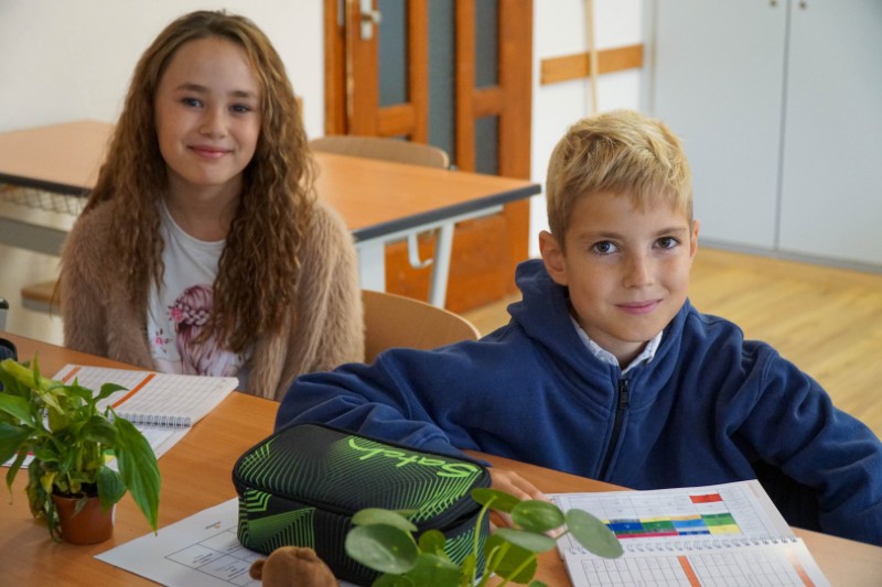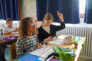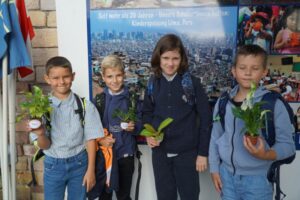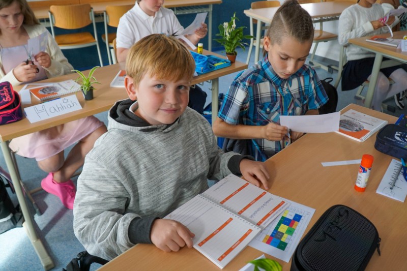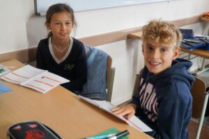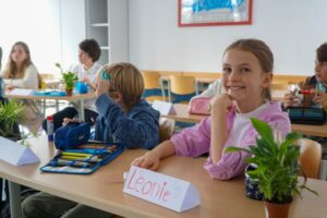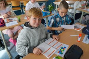 Auch für die Kinder gab es im Klassenzimmer eine Überraschung: Ein kleines Geschenkeset, besteht aus Stiften mit dem Schullogo, Radiergummi, Spitzer und Geordreick wartete auf alle. Dann durften alle den frisch ausgedruckten Stundenplan sorgfältig in den neuen Lernplaner einkleben und der Planer wurde Schritt für Schritt erklärt.