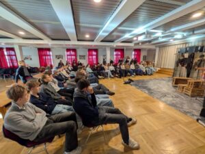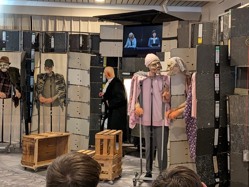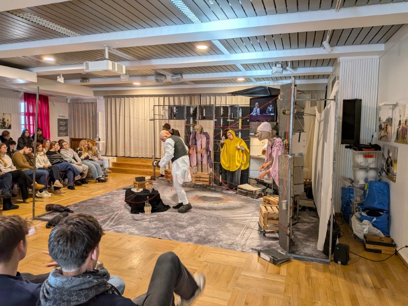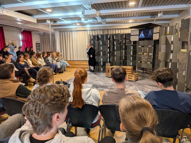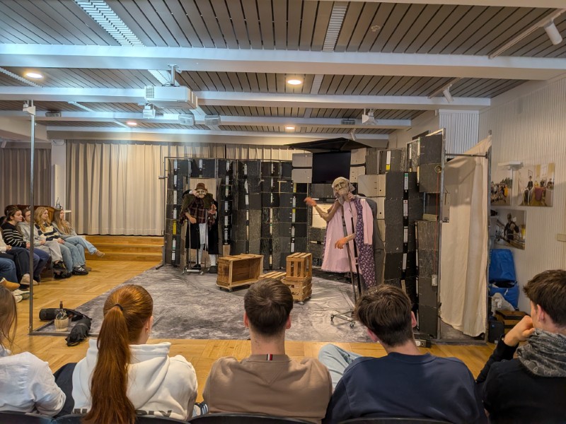 Aber keine Bange, denn alles war nur Theater und zwar im wahrsten Sinne des Wortes: Am Freitag, 09.01.2026, gastierte von 10:00 bis 11:30 Uhr das TheaterMobileSpiele aus Karlsruhe in der Aula. Ein Schauspieler und eine Schauspielerin brachten Heinrich von Kleists „Der zerbrochne Krug“ auf die Bühne, unterstützt durch Videotechnik und Puppen.