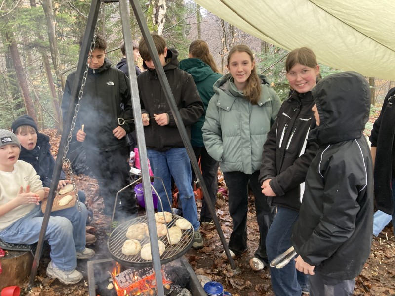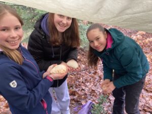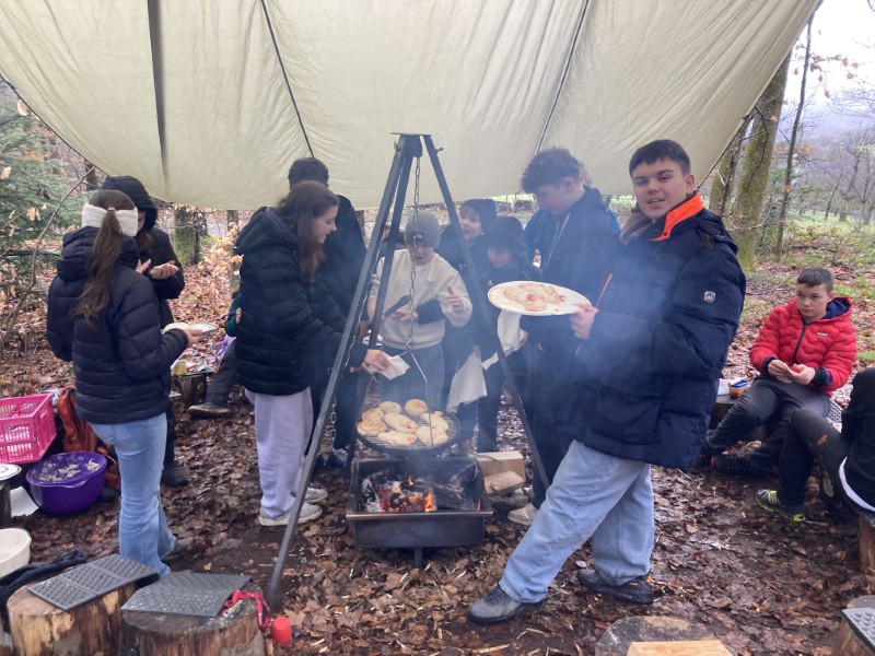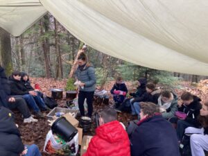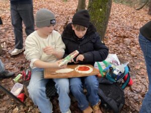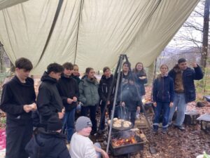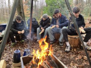 Ein kulinarisches Highlight folgte mit Pizza-Calzone über dem offenen Feuer. Die richtige Teigdicke? Gar nicht so leicht! Manche Exemplare waren etwas rustikal, viele aber überraschend perfekt. Am Nachmittag arbeiteten wir weiter an unseren Waldhütten – sie nehmen immer mehr Gestalt an. Vielleicht ist im Sommer tatsächlich eine Übernachtung möglich?