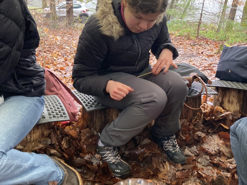 Anschließend ging es um das Feuer – einem echten „Gamechanger“ in der Menschheitsgeschichte: Wärme, Licht, Schutz und bessere Nahrung. Aber natürlich sprachen wir auch über die Gefahren und den verantwortungsvollen Umgang damit. Bei Dauerregen war die größte Herausforderung allerdings nicht das Löschen, sondern das Trockenhalten!
