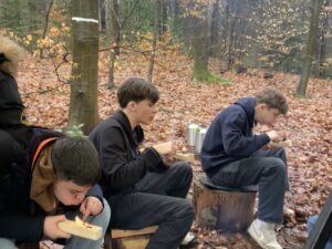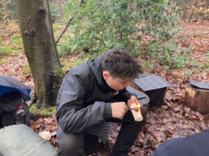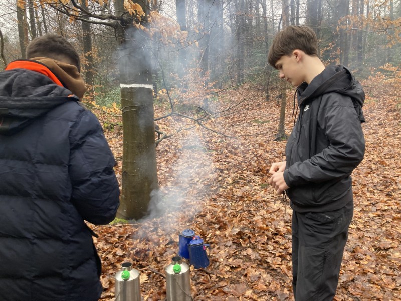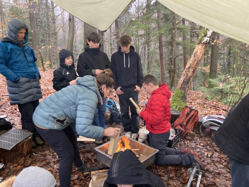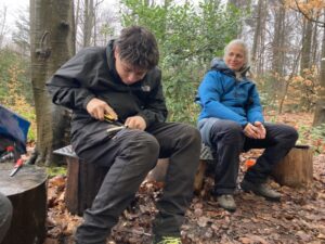 Mit viel Teamwork spannten wir eine Tarp-Plane zwischen die Bäume, um einen geschützten Platz zu schaffen. Nach einigen Versuchen stand unser „Waldwohnzimmer“ – inklusive Feuerstelle. Mit Feuerstahl und Zunder wurde geduldig experimentiert, bis schließlich die ersten Flammen loderten. Auf den Kelly Kettles dampfte bald heißer Tee, und ein Lagefeuer in der Feuerschale sorgte für wohlige Wärme.
