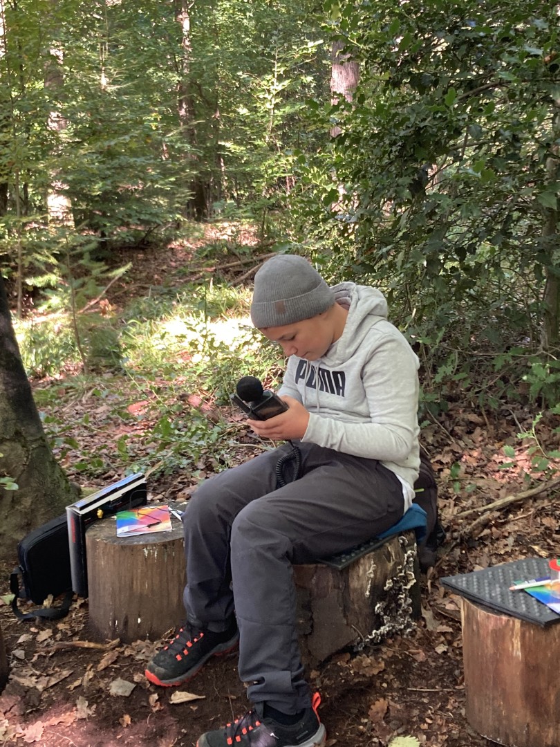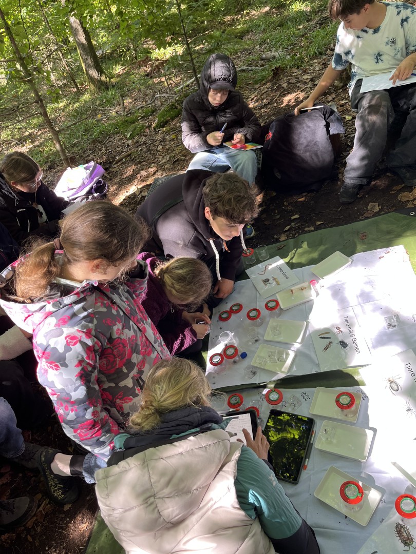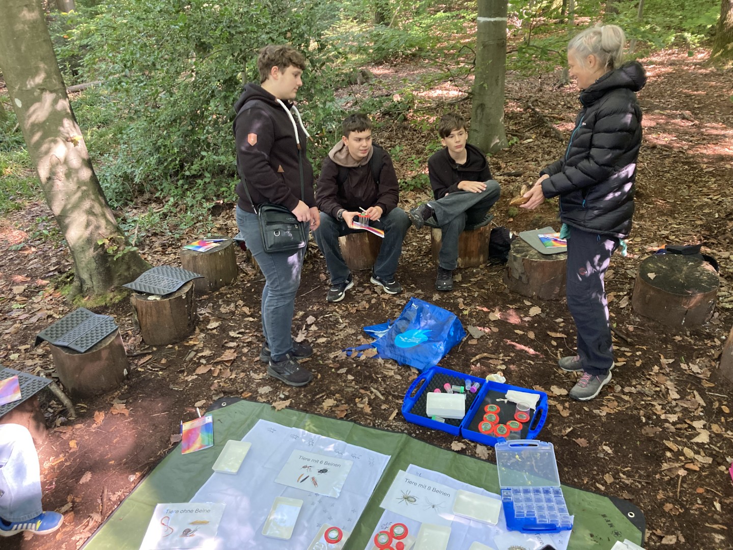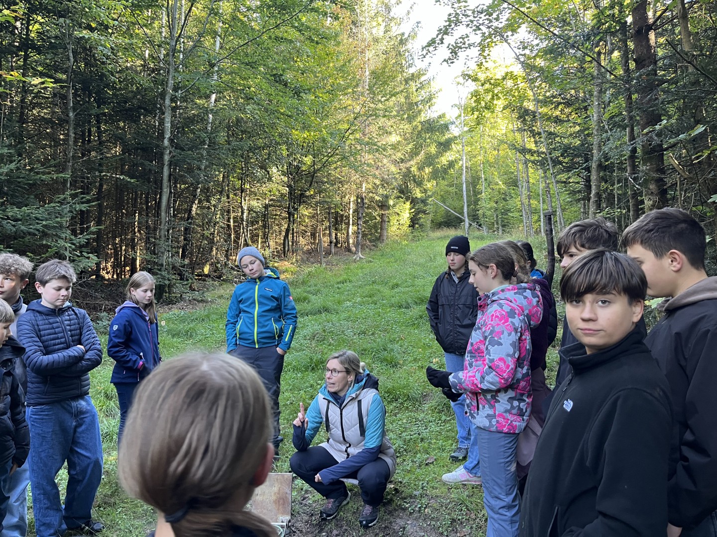 Nach einer Mittagspause, in der Sonne oder beim Bau von kleinen Waldhütten ging es dann an unsere Forschungsprojekte. In 5 Gruppen sammeln wir dieses Schuljahr weiter Daten zum Klima, zur Boden- und Wasserqualität und zur Entwicklung der Artenvielfalt und einzelner Bäume in unserem Waldstück. Die Projekte wurden von 2 Schülerinnen der letzten Waldgruppe übergeben. Danke euch für eure Unterstützung!
