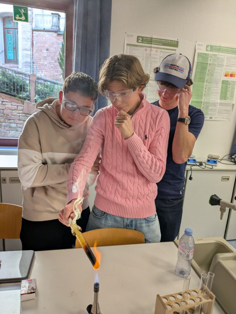 Mit ein paar Versuchen zum “Warm-werden” bereitet sich die Eingangsklasse des beruflichen Gymnasiums auf den Chemieunterricht des neuen Schuljahres vor.