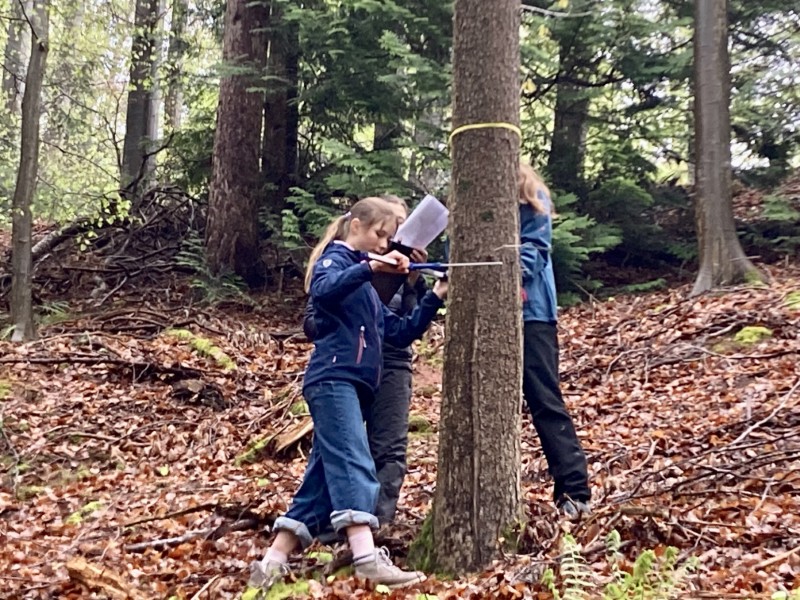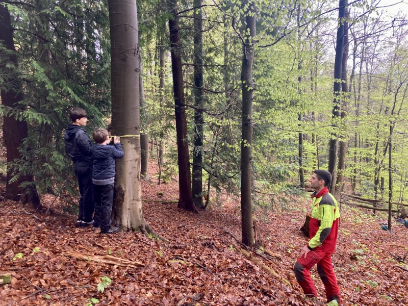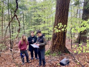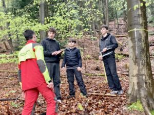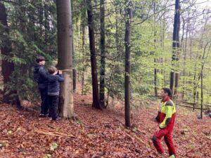 Nach einer kurzen Pause durften wir Forsttrainee Tobias Müller begrüßen, der mit uns intensiv und praxisnah zum Thema Wirtschaftswald arbeitete. Für die praktischen Aufgaben gingen wir tief in den Wald hinein und bewegten uns quer durchs Gelände – bergauf und bergab. Anschaulich lernten wir dabei viel über nachhaltige Waldwirtschaft, den CO₂-Kreislauf sowie die aktuellen Herausforderungen, denen Wälder im Zuge des Klimawandels begegnen. Besonders spannend war, dass die Schülerinnen und Schüler selbst in die Rolle von Försterinnen und Förstern schlüpfen durften: Sie bestimmten und vermaßen Bäume, bestimmten Holzvolumen, errechneten Holzpreise und überlegten, welche Bäume im Wald wie und warum gezielt gefördert werden sollten. Dabei spielten nicht nur wirtschaftliche Überlegungen, sondern auch ökologische Aspekte eine Rolle.