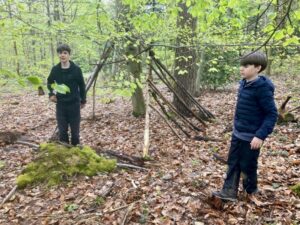 Nach einer gemeinsamen Mittagspause, in der auch an den Waldhütten weitergearbeitet wurde, widmeten wir uns dem kreativen Thema LandArt. Zunächst fertigten wir in einer kurzen Sitzplatzarbeit kleine Skizzen an. Anschließend gestalteten wir mit Naturmaterialien kleine Kunstwerke. Ziel war es, durch gezielte Anordnung in der scheinbaren Unordnung des Waldes Aufmerksamkeit zu erzeugen – was uns mit kreativen Ergebnissen gelungen ist.