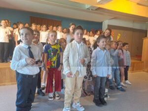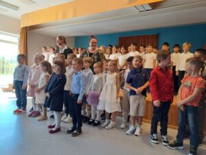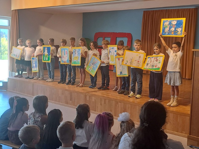 Nach der Begrüßung durch die Schulleitung eröffneten die Drittklässler die Feier mit dem schwungvollen Lied „Hurra, hurra, die Schule beginnt“ und sorgten damit sofort für gute Stimmung. Anschließend präsentierte die Klasse 2 eine Bildergeschichte von einem Hasen mit Hängeohr, der am Ende feststellt: „Alle sind Freunde!“ – eine gelungene Botschaft zum Schulstart, die auch in einem Tanz aus dem “König der Löwen” vorkam und mit viel Applaus bedacht wurde.